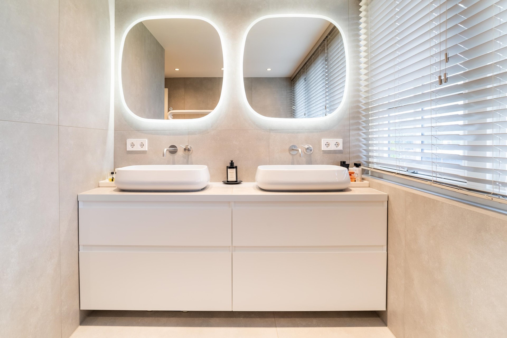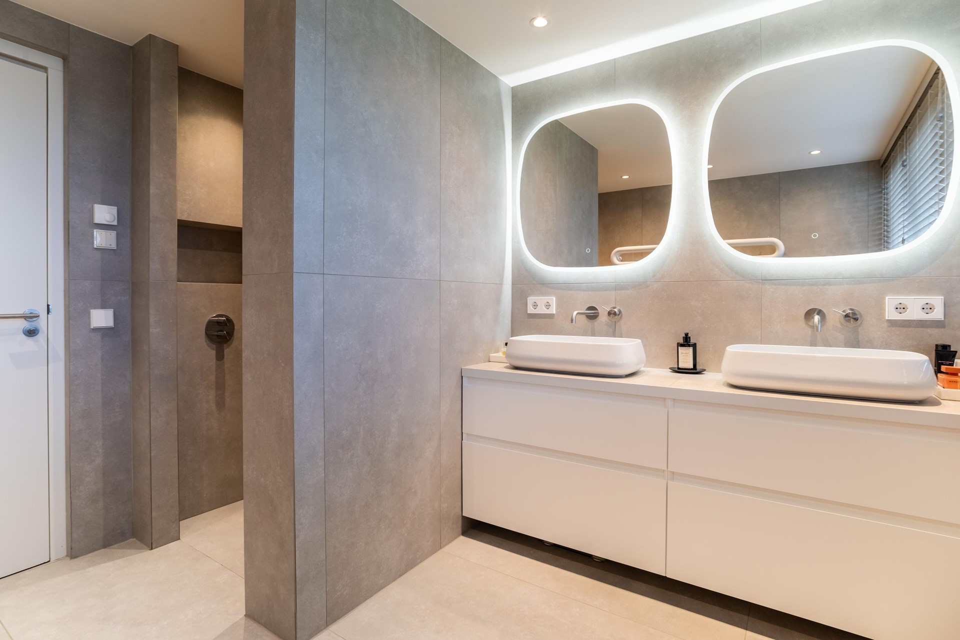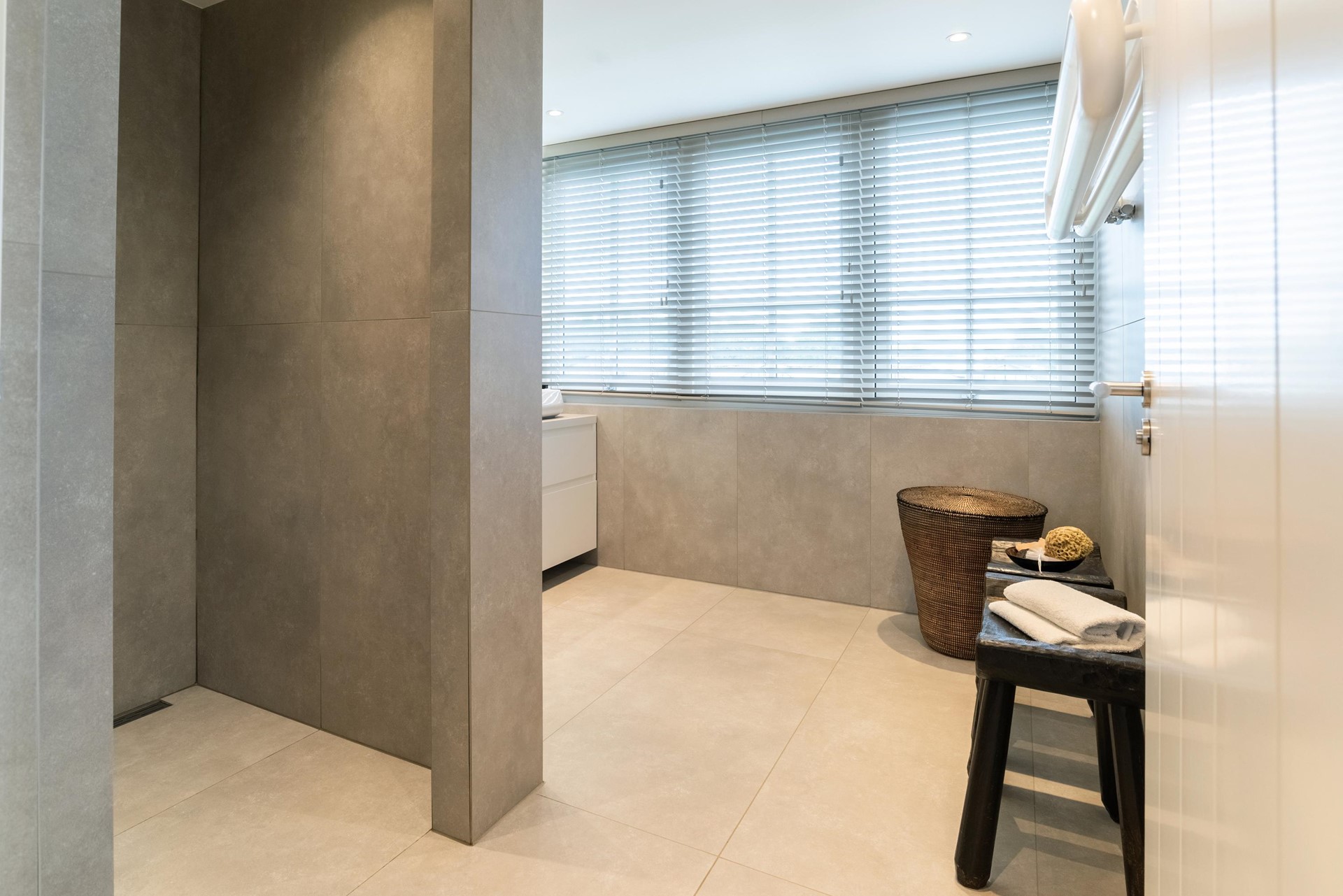 • Luxe badkamer met inloopdouche, designradiator en dubbel wastafelmeubel