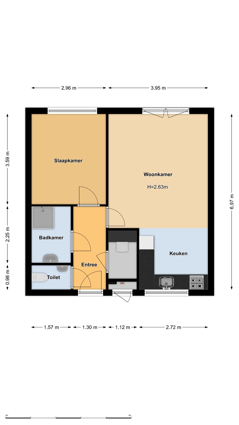 Entree woning, toilet, badkamer, berging met opstelplaats voor wasmachine en droger, woonkamer met open keuken en een frans balkon en een slaapkamer.